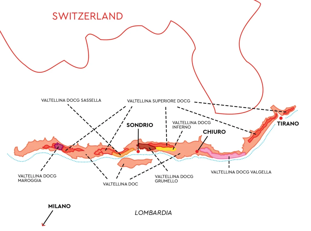 발텔리나 네비올로는 흔히 ‘밀라노의 네비올로’라는 별칭으로도 불림. 이는 단순한 행정적 구분을 넘어 밀라노 Milan 와의 깊은 상업적 역사와 랑게 Langhe 지역 네비올로와의 스타일적 차별화를 반영한 기준.