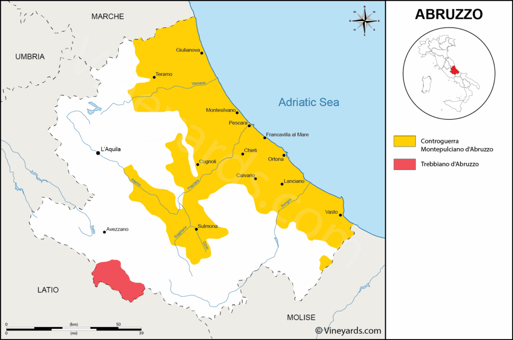 아드리아해 Adriatic Sea와 아펜니노 산맥 Apennino, 특히 그란 사소 Gran Sasso의 영향을 동시에 받는 구릉 지대에 위치함. 해발 약 150–400m 범위에 포도밭이 분포하며 점토와 석회질이 혼재한 이회토질 Marn 토양. DOC보다 품종과 양조 자율성이 높아 단일 품종 표기와 현대적 스타일링이 가능함. 페코리노 Pecorino, 몬테풀치아노 Montepulciano, 트레비아노 Trebbiano 등이 주요 품종.